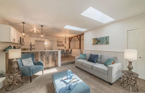 This beautifully renovated sideways ranch-style home features 3 bedrooms and 1 bathroom, designed with a highly desirable open floor plan. Upon entering, you'll be greeted by a spacious living room with soaring vaulted ceilings and skylights that fill the space with an abundance of natural light. The open layout seamlessly connects the living room to the dining area, creating a perfect environment for entertaining and family gatherings.